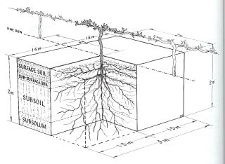 現代のぶどう栽培、とりわけニューワールドといわれるぶどう産地では、フランスほど『土壌』そのものをその中心に据えていないようです。それよりもむしろ『気候』などの外部要因が与える影響のほうが中心的に議論されています。 それは、フランスのようにそれぞれ隣り合う小さな畑の区画について、出来上がるワインの違いを比較していないという背景的な違いは確かにありますが、近年の科学的なアプローチにより、ワインに個性を与える要因は、温度や湿度、太陽光の強さなど外部的な気候要因のほうがより大きいということが知られるようになっているからです。 特に光合成による糖の生成過程は重要です。またぶどうへの水分供給の度合いも、ぶどう(ワイン)の質に影響を与える要因として重要で、水分供給を適度に少なくしてぶどうにストレスを与えたほうが、色づきがよく良質なぶどうが収穫できるということもわかっています。 このぶどうへの水分供給は、土壌の物理的な組成と関連します。ぶどうと土壌の関係で重要な部分はここに表れてきます。 土壌の組成とルートシステム(root system) 植物の生育にとって最も重要なのは、水と光です。この二つがないと植物は生存できません。ここではその二つのうち、土壌との関連で『水の供給』を取り上げることになりますが、問題は、どういった水分供給が結果的によいぶどう、すなわちよいワインに結びつくのかということです。 水分供給と土壌の組成の関係はわかりやすく、要は土壌が水分を蓄える程度の問題です。つまり、小石や砂の多い土壌は水分の保持が低く、粘土のような密な土壌は逆に水分の保持が高いことになります。 すなわち土壌の水はけの程度により、ぶどうの根への水分補給の程度が変わり、それがぶどうの生育状態に影響するというわけです。先に述べたように、ぶどうの水分補給は若干少なめであるほうが良質のぶどうが期待できるとすると、そのためには排水のよい土壌のほうがよいということになってきます。 ![]() ぶどうのルートシステム(root system) ぶどう自身は自分は良質なワインになろうという意思を持って生きているわけではありませんが、水分が不足気味の土壌においては、ぶどうは生き延びるために水分を探して、根は深く土中に伸びようとします。 その結果、根は土中に水源(water table)を探し当て、適度な水分補給に成功するのです。したがって一般的には、ぶどうはこうした土壌環境におかれたときにより良質なぶどうを結実する、ということになります。 ![]() ![]()