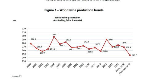 | Home > 2017年の世界のワイン生産量は、過去50年来で最低水準―OIV 2017年10月27日 OIV (Organisation of Vine and Wine)の発表によると、2017年の世界のワイン生産量は2億4670万ヘクトリットル(OIVの推定)となり、2016年比8.2パーセント減少した。この生産量は1961年以来の低水準で、ここ50年来で最低の水準となる見通しだ。